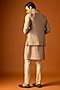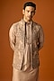 Featuring a coffee brown bundi jacket in silk base with embroidery. It is paired with a kurta and pants. Accentuate it with kolhapuris or embroidered juttis for an elegant yet easy going look, perfect for pooja ceremonies, festive gatherings or mehendi celebrations.