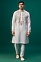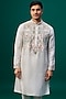 Featuring an ivory kurta in tussar base with threadwork, resham hand and machine embroidery. It is paired with spun cotton pants. Perfect for a festive occasion, wedding or engagement ceremony, exuding traditional charm and elegance.