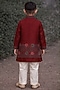 Featuring a red indowestern jacket for boys in raw silk base with hand and resham thread work. It is paired with a kurta and spun cotton pants. Accessorize this set with mojris and a watch for a stylish ensemble, ideal for ceremonial events or any festive occasion.