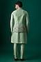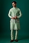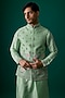 Featuring a mint bundi jacket in silk base. It is paired with a kurta and churidar. Style it with loafers for a royal and refined look, perfect for a festive ready look.
