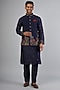Featuring a navy blue bundi jacket in tussar base with resham and thread work. Perfect for any festive occasion or wedding ceremony, exuding charm and elegance.