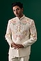 Featuring an off-white bandhgala in raw silk base with threadwork, resham hand and machine embroidery. It is paired with trousers. Perfect attire for a wedding, sangeet or engagement ceremony, exuding traditional charm and timeless elegance.