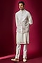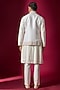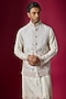 Featuring an off-white bundi jacket in raw silk base with resham, threadwork hand and machine embroidery. It is paired with a tussar kurta and spun cotton pants. Perfect attire for a festive occasion, wedding or engagement ceremony, exuding traditional charm and timeless elegance.