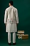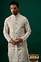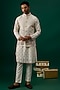 Featuring an off-white bundi jacket in raw silk base with resham, threadwork hand and machine embroidery. It is paired with a tussar kurta and spun cotton pants. Perfect attire for a festive occasion, wedding or engagement ceremony, exuding traditional charm and timeless elegance.