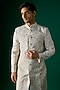 Featuring an off-white sherwani in silk base. It is paired with pants. Style it with mojaris and malas for a wedding, sangeet or engagement ceremony, exuding charm and elegance.