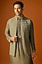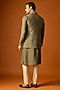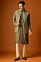Featuring an olive green bundi jacket in silk base with embroidery. It is paired with a kurta and pants. Accentuate it with kolhapuris or embroidered juttis for an elegant yet easy going look, perfect for pooja ceremonies, festive gatherings or mehendi celebrations.