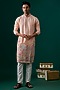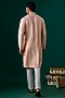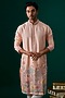 Featuring a peach kurta in tussar base with resham, threadwork hand and machine embroidery. It is paired with spun cotton pants. Perfect attire for a festive occasion, sangeet or engagement ceremony, exuding traditional charm and timeless elegance.