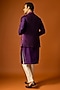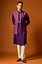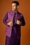 Featuring a purple bundi jacket in silk base with embroidery. It is paired with a kurta and pants. Accentuate it with mojaris for an elegant yet easy going look, perfect for a festive occasion, cultural event, pooja, wedding or engagement ceremony.