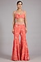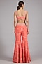 Sana Barreja presents a coral jacket in pure chanderi silk base with zardosi hand embroidery. It is paired with floral printed pants and a bustier. Accentuate it with statement jewellery, a clutch, and block heels for sangeet or engagement ceremony.