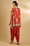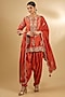 Featuring a coral kurta in pure dupion silk base with resham, cutdana, sequins, beads and zardosi hand embroidery. It is paired with draped dhoti pants and a dupatta. Accentuate it with statement jewellery and heels for a festive occasion or pooja ceremony.