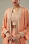 Featuring a peach ruched lehenga in georgette base. It is paired with a matching hand embroidered blouse and a jacket.