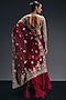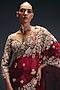 Sana Barreja features a red draped ruffled saree in silk organza base with crystal, sequins, thread and zardosi embroidery. It is paired with an embroidered blouse. Elevate the look with green zircon earrings, sleek hair bun and a shimmer clutch for making a timeless statement on a cocktail, sangeet or grand festive celebrations.
