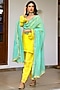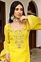 Featuring a yellow kurta in soft chanderi base with mirror, aari and zardosi embroidery. It is paired with embroidered salwar pants and a firozi embroidered dupatta. Accentuate it with polki jewellery and heels for a festive occasion or haldi ceremony.