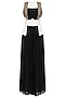 This set features a white front open jacket in scuba base with metallic sequins, beads and stones embroidery on the front. It is paired with black scuba bustier and pleated georgette palazzo pants.