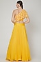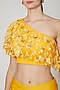 Featuring a yellow crop top in georgette and net base with sequins hand embroidery and one shoulder. It is paired with a matching skirt.