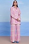 Featuring a cassata pink double breasted blazer shirt in linen base with floral machine embroidery and bold stripes detail, including notched lapel and functional side pockets. It is paired with high-waist bell bottom pants having side button closure and an elasticated back. Accentuate it with statement earrings and heels for sophisticated look.