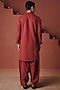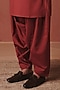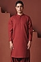 Featuring a brick red kurta in cotton linen base with band collar. It is paired with dhoti. Accentuate it with kolhapuri sandals for a festive occasion, sangeet or an intimate pooja ceremony.