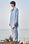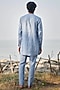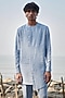 Featuring a sky blue kurta in pure linen base with a round neck collar, mother-of-pearl buttons and stripe detail. It is paired with pants having partially elasticated waistband. Style it with tan kolhapuris and a minimal silver bracelet, perfect for a festive look or daytime functions.