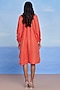 Featuring a tangerine panelled dress in linen base with lace inserts, puff sleeves and a drawstring neckline. Accentuate it with statement earrings and heels for a summer casual look.