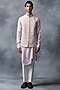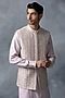 Featuring a dusty rose bundi jacket in silk and crepe base with pearl and thread work. It is paired with a paneled kurta and white pants. Perfect for a wedding or engagement ceremony.
