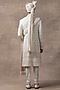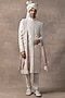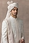 Featuring an ivory sherwani in organza, kota and silk base with thread, sequins and pearl work. It is paired with a matching kurta, pants, a dupatta and a safa fabric.
