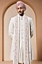 Featuring an ivory sherwani in self fabric base with sequins and thread work. It is paired with pants and a dupatta. Perfect wear for a wedding or engagement ceremony, exuding traditional charm and elegance.