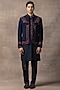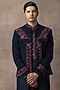 Featuring a navy blue open bandhgala jacket in sandwash base with red thread work. It is paired with a matching kurta, and pants.