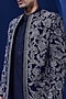 Featuring a navy blue open bandhgala in velvet base with zari, sequins and pearl work. It is paired with a kurta and pants. Style it with a mojaris for a wedding, sangeet or engagement ceremony.