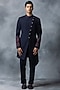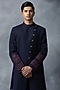 Featuring a navy blue slant-cut indowestern in sandwash base with thread work. It is paired with matching pants.