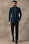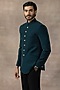 Featuring a teal bandhgala jacket in sandwash base with pintuck work. It is paired with contrasting pants.