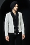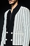 Featuring a black and white striped jacket in jersey base. It is paired with pants. Style it up with shoes for an evening party look, exuding charm and elegance.