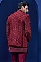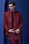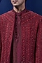 Featuring a wine open bandhgala in organza base with pearl, sequins and thread work. It is paired with a kurta and pants. Style it with a mojaris for a wedding, sangeet or engagement ceremony.