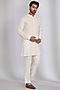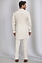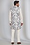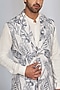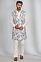 Featuring a white indowestern in french jacquard base with abstract print. It is paired with a crepe kurta and trousers. Perfect wear for festive occasions or pre-wedding ceremonies.