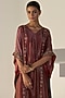 Featuring a rust kaftan in tissue silk base with hand embroidery. It is paired with tissue silk pants and an inner. Accentuate it with jhumkas and embellished heels for a traditional yet elegant look, perfect for festive gatherings or wedding celebrations.
