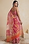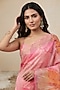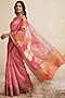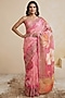 Featuring a soft pink saree in linen base with botanical motifs print. Accentuate it with a blouse, polki earrings and block heels for a graceful look, perfect for festive soirees, cultural events or a pooja ceremony.