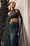 Featuring a bottle green fish cut skirt in georgette base with cutwork embroidery. It is paired with an embroidered blouse and a net drape. Style it with heels and statement accessories for a sangeet or cocktail ceremony.