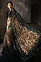 Featuring a green and gold ombre saree in net base with cutwork, sequins and mirror work. It is paired with a velvet blouse and a petticoat. Accentuate it with statement jewellery and heels for a festive occasion, wedding or engagement ceremony.