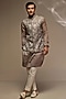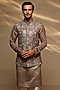 Featuring a grey bundi jacket in silk base. It is paired with a kurta. Style it with tailored trousers, polished mojaris, and a pocket square for refined charm. Ideal for festive gatherings, family functions, weddings, or evening celebrations.