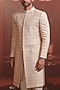 Featuring an ivory sherwani in silk base. Style it with embroidered mojaris, a soft gold stole, and a classic watch for a regal touch. Perfect for weddings, engagement ceremonies, festive celebrations, or grand cultural events.