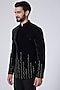 Featuring a midnight blue bandhgala jacket in velvet base with vertical metal trim lines. This contains only one piece.
