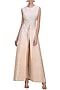 Featuring a shaded peach mid bust chanderi lotus print cape with pallazos.