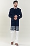 Featuring a dark blue sherwani in all weather poly viscose base with thread embroidery and pintucks detail. It is paired with contrasting ivory trousers.