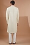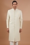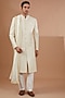 Featuring an ivory sherwani in italian lucknowi fabric base. It is paired with a cotton silk kurta, pyjama pants and a stole. Perfect wear for a mehendi or sangeet ceremony.