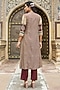 Featuring a burgundy pleated kurta in muslin silk base with ajrakh print, placket detailing, sequins, beads and stone embellishments. It is paired with shantoon slip-on trousers having pockets. Style it with dangler earrings and heels for a festive occasion or a pooja ceremony.