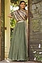 Featuring a green pleated gown in pure chinon silk base with an attached pleated drape and one-shoulder cape, including beads, sequins, and stone embellishments. It is paired with a matching belt having handwork and coin hangings.