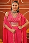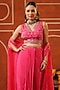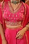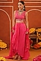 Featuring a hot pink cape in organza silk base with sequins embroidery. It is paired with a crepe silk embroidered choli and a pleated asymmetric draped skirt. Perfect for daytime weddings, festive celebrations, engagements, and family gatherings. Pair with pearl or kundan polki jewellery and nude heels for a graceful look.