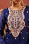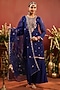 Featuring a midnight blue straight kurta in organza silk base with zari and dori embroidery, including a round neckline. It is paired with shantoon sharara pants and an organza silk dupatta. Perfect for daytime weddings, festive celebrations, engagements, and family gatherings. Pair with pearl or kundan polki jewellery and nude heels for a graceful look.