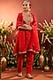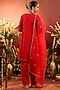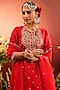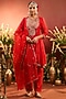Featuring a red anarkali in organza silk base with zari and dori embroidery, including a round neckline. It is paired with shantoon salwar pants and an organza silk embroidered dupatta. Perfect for daytime weddings, festive celebrations, engagements, and family gatherings. Pair with pearl or kundan polki jewellery and nude heels for a graceful look.