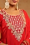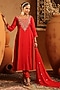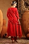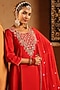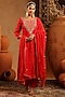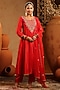 Featuring a red anarkali in russian silk base with thread handwork embroidery. It is paired with shantoon pants and a chiffon dupatta. Accentuate it with kundan polki jewellery and embellished heels for festive celebrations, weddings, or mehendi ceremonies.