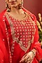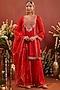 Featuring a red straight kurta in organza silk base with zari and dori embroidery, including a round neckline. It is paired with shantoon sharara pants and an organza silk dupatta. Perfect for daytime weddings, festive celebrations, engagements, and family gatherings. Pair with pearl or kundan polki jewellery and nude heels for a graceful look.